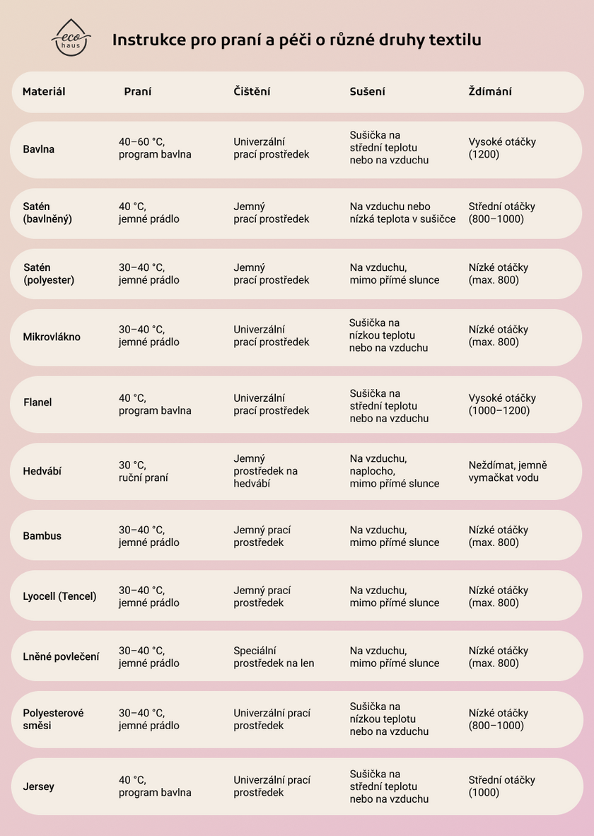 Výjimečným materiálem je vlna. Její vlastnosti umožňují minimální četnost praní a to i v případě přikrývek. Většinou stačí, když necháš vlněné přikrývky vyvětrat nebo je vypereš ručně jen v mírně teplé vodě do 30 °C. Můžeš také využít čistírnu a suché čištění.