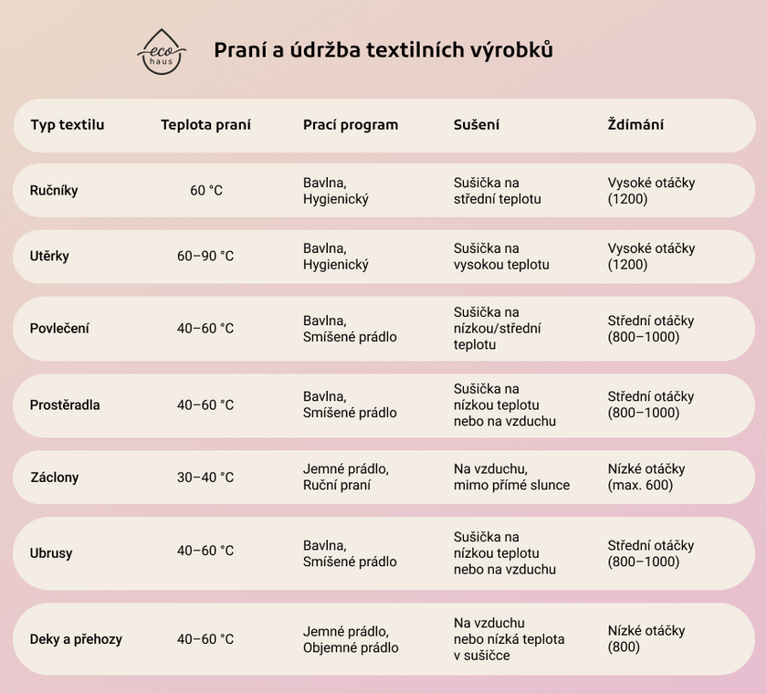 Ručníky per pravidelně a na vyšší teplotu 60 °C, aby byly hygienicky čisté. Používej kvalitní prací prostředky a vyhýbej se aviváži, která snižuje savost.