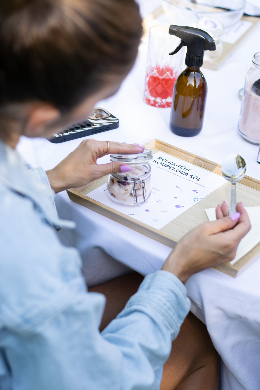 Základem receptu je epsomská sůl, která díky obsahu hořčíku pomáhá uvolňovat svalové napětí, podporuje regeneraci těla, zmírňuje stres a může přinést úlevu při únavě nebo menstruačních bolestech. Himalájská růžová sůl obsahuje minerály prospěšné pro pokožku, má jemný peelingový efekt a dodává směsi krásný, estetický vzhled. K solím se přidávají sušené květy, například levandule nebo růže, které mají aromaterapeutický účinek a dělají z obyčejné koupele malý rituál. Pro skvělou vůni jsou ideální esenciálního oleje, ideálně božská levandule, luční kvítí nebo přímořský vánek.