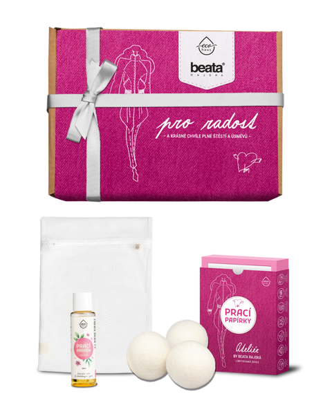 Právě prací papírky s vůní ateliér tvoří základ dárkového setu, který Beata osobně sestavila. Jde o její nejoblíbenější produkty EcoHaus, které sama denně používá a pravidelně doporučuje svým klientkám.